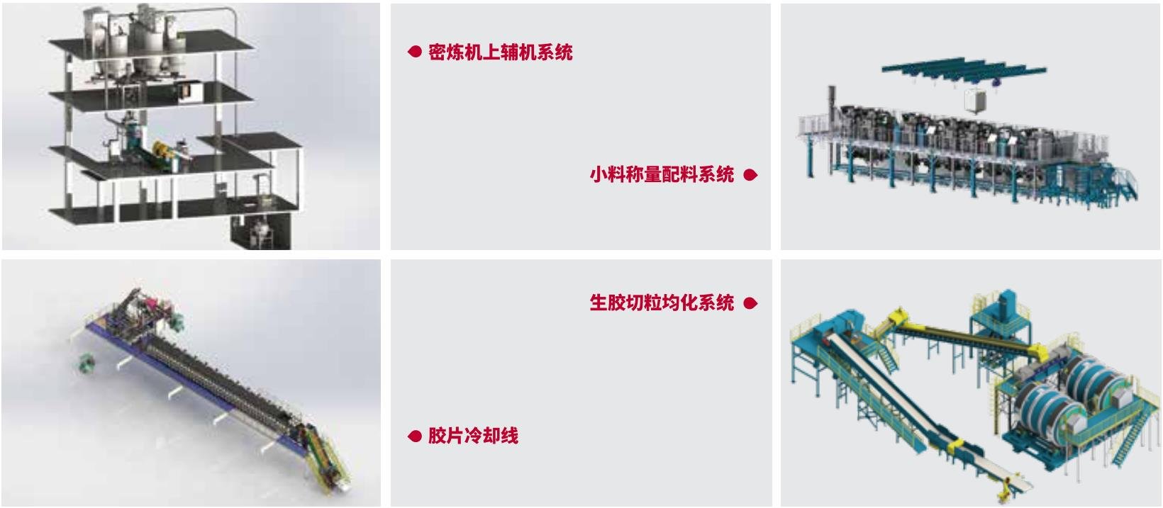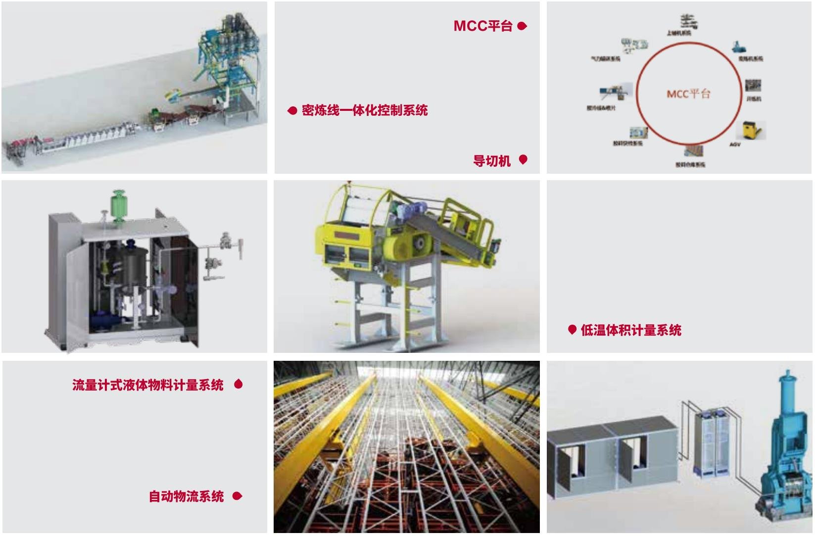 通過密煉機上輔機系統、高精度稱量配料系統、生膠切粒均化系統和自動翻膠系統等先進自動化裝備實現車間自動稱量和自動生產,運用AGV、RGV、EMS、機器人和立體庫等先進自動化倉儲物流設備實現車間自動物流和自動存儲,結合條碼、RFID、MES和機器人等先進信息化技術實現車間信息化和數字化,運用人工智能、大數據分析、APS高級排產算法等智能技術實現車間智能生產和智能服務,為客戶提供高效率、高質量、低成本、低能耗、綠色環保的智能煉膠車間。