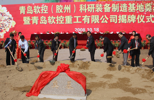 中國石化協(xié)會會長李勇武對公司此戰(zhàn)略舉動高度評價,認為軟控一直在努力實現中國老橡膠人多年的夢想,他還進一步表達了對軟控的殷切期望,并與山東省政協(xié)副主席、工商聯主席王乃靜,青島市人大常委會主任張若飛,膠州市委書記祝華一起為軟控重工揭牌;全體到場嘉賓共同為“基地”奠基。