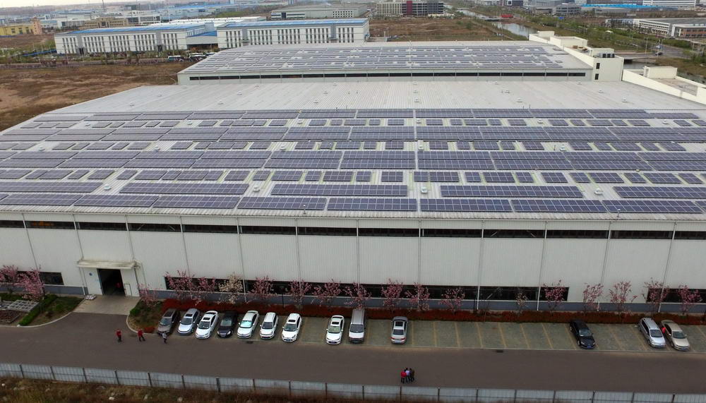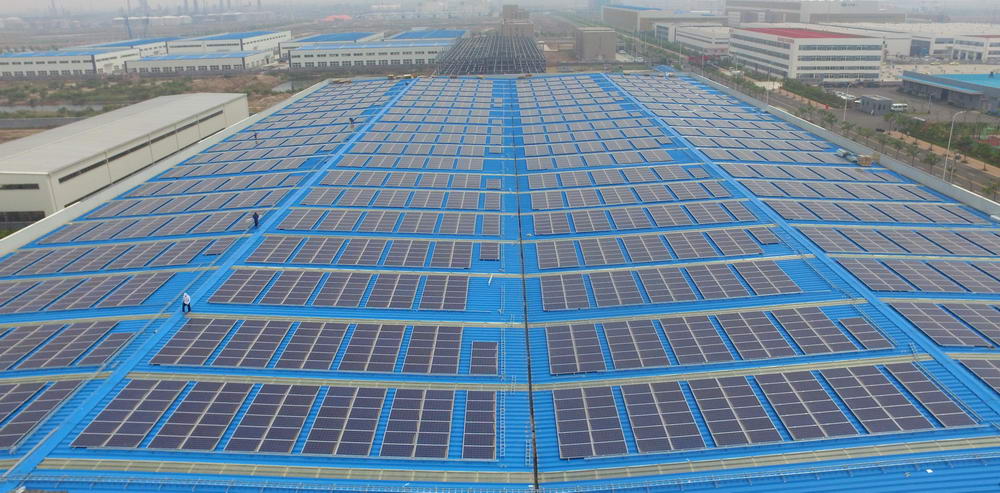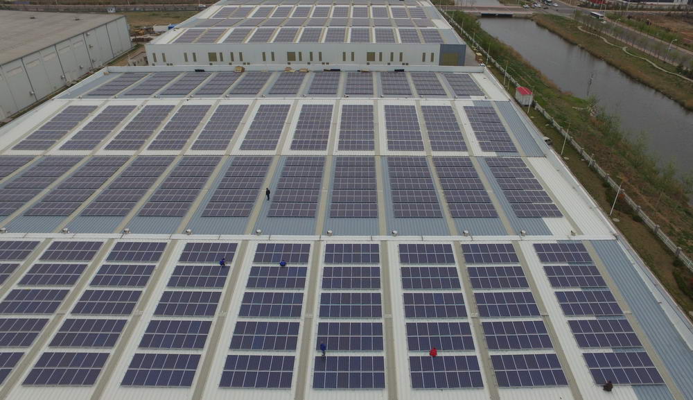 借此機(jī)會(huì),青島華控能源牽手青島高新區(qū)內(nèi)的科捷機(jī)器人和佳友機(jī)械廠,在其房屋頂建設(shè)了光伏發(fā)電項(xiàng)目作為試點(diǎn)。一塊塊一人多高的矩形太陽能板均勻的排列在廠房屋頂,十分規(guī)整,科技感十足,這就是光伏發(fā)電裝置。太陽能板平鋪在廠房屋頂既節(jié)約了空間,同時(shí)也可以讓太陽能板充分接受陽光照射。