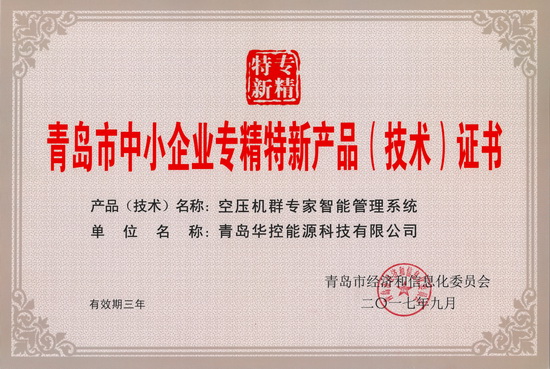 同時,華控能源自行研發的適用于用能企業的空壓站節能監控管理系統也順利通過復審,再次被認定為青島市專精特新產品。