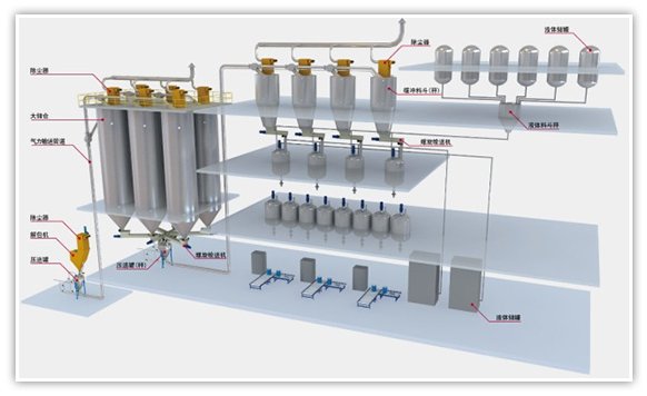 1、不同包裝形式(袋裝、太空包、槽車等)的松散物料的氣力輸送系統(tǒng);