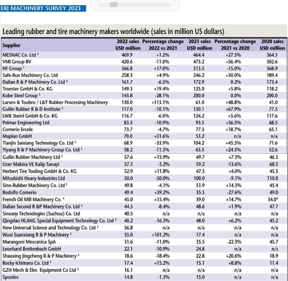 在最新出版的歐洲橡膠雜志(European Rubber Journal) 5/6月刊,公布了2022年全球橡膠機械行業企業的銷售收入排名,軟控(MESNAC)位居第一。